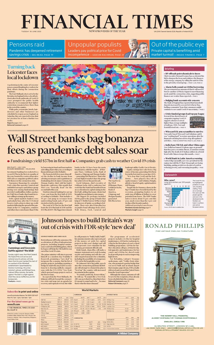 The Financial Times reports that investment banking fees have “rocketed” to a record $57bn in the first six months of the year. The paper says fees have been boosted by a series of lucrative debt sales as companies “grabbed cash” to tide them over the coronavirus crisis.