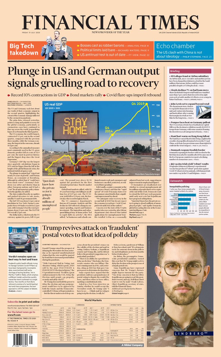 The Financial Times highlights what it calls “grim data” from the United States and Germany which shows their economic output has plunged. The paper says it points to “a long and painful recovery for the global economy”.