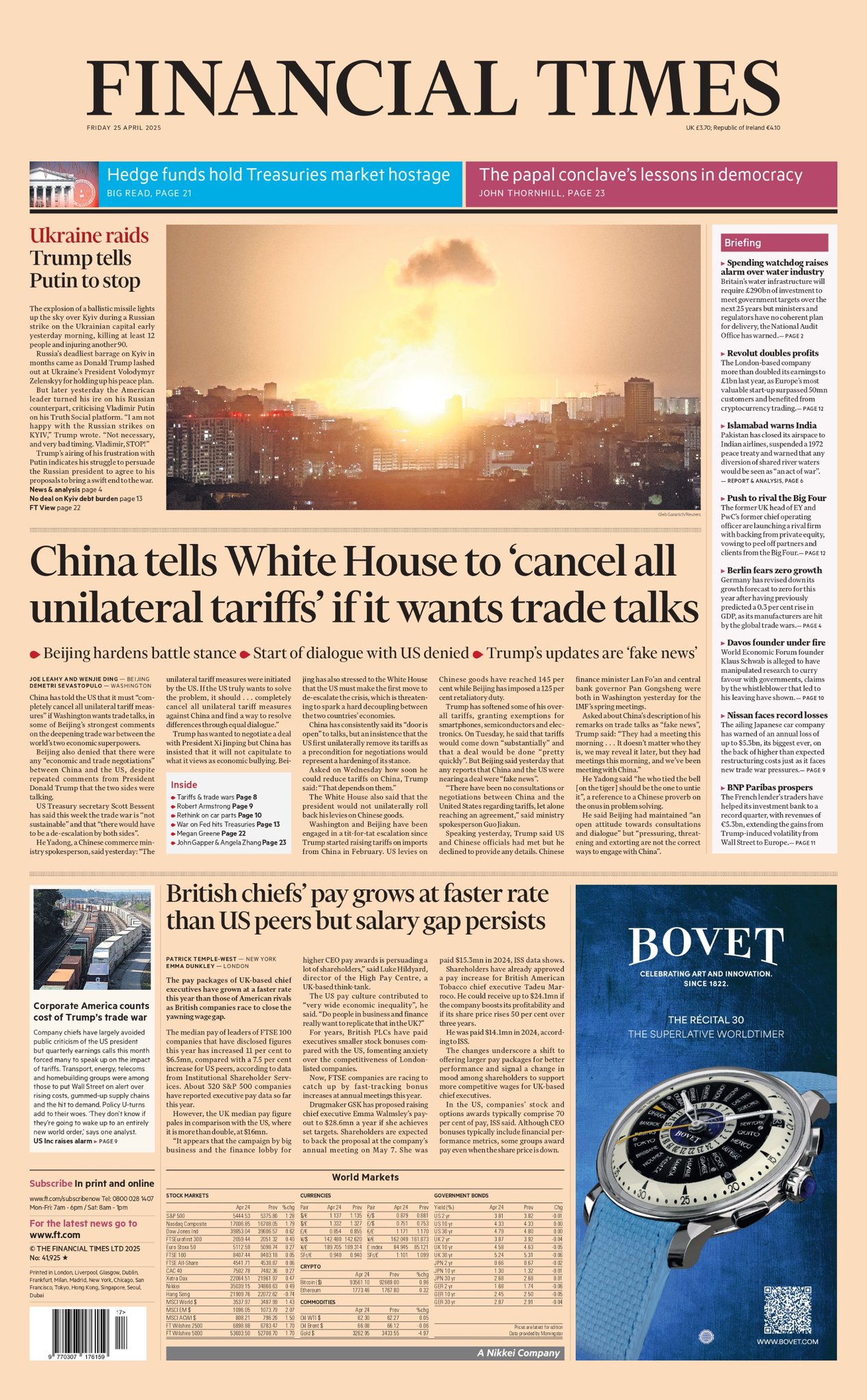 An image of Mr Hume, an Irish nationalist leader, being led away by a British soldier during a 1971 civil rights demonstration appears on the Financial Times front page. The paper’s main story says HSBC’s profits have fallen 96% amid the pandemic and US-China tensions.