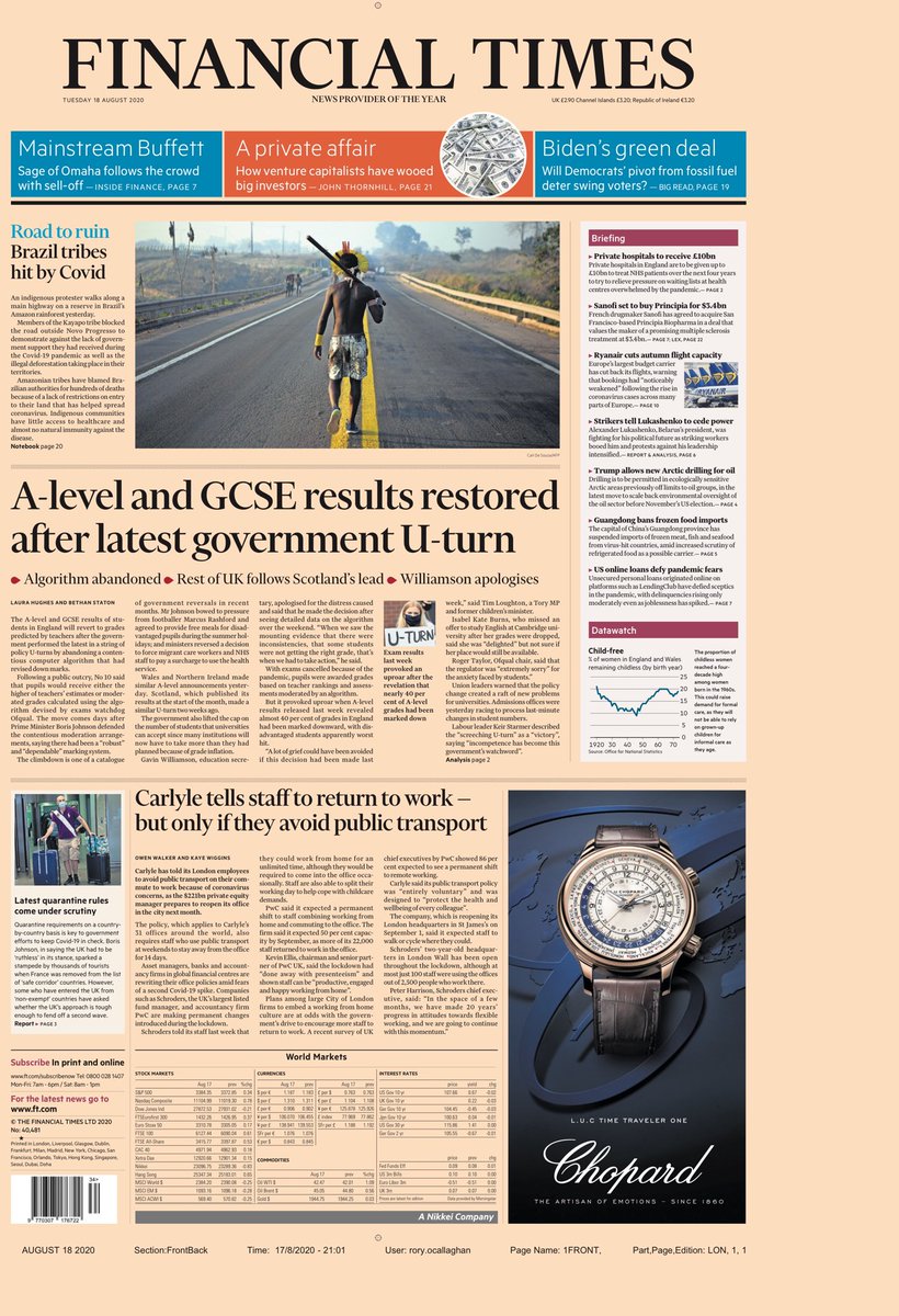 The Financial Times says the exams climbdown is the latest in a series of “U-turns” following a public outcry, citing the changes to free school meals over the summer which came after a campaign led by footballer Marcus Rashford. The paper also carries a story about private equity manager Carlyle telling staff to avoid using public transport when they return to the office next month.