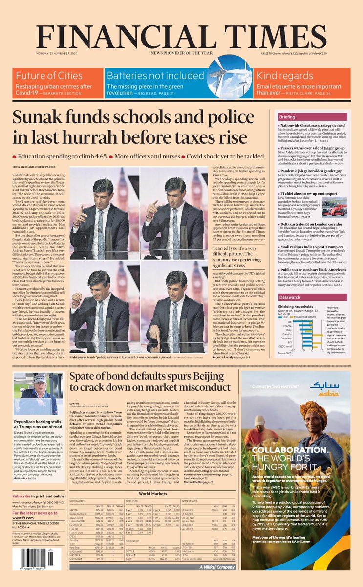Despite the chancellor’s warnings that the UK will have to tackle “the scale of the economic shock” caused by the pandemic, the Treasury will stick with plans to boost funding for schools and police, the Financial Times reports. The paper describes this as a “last hurrah”. School spending will rise by 4.6% in 2021-22 and the government is on track to enlist 20,000 new police officers by 2023, the paper adds.