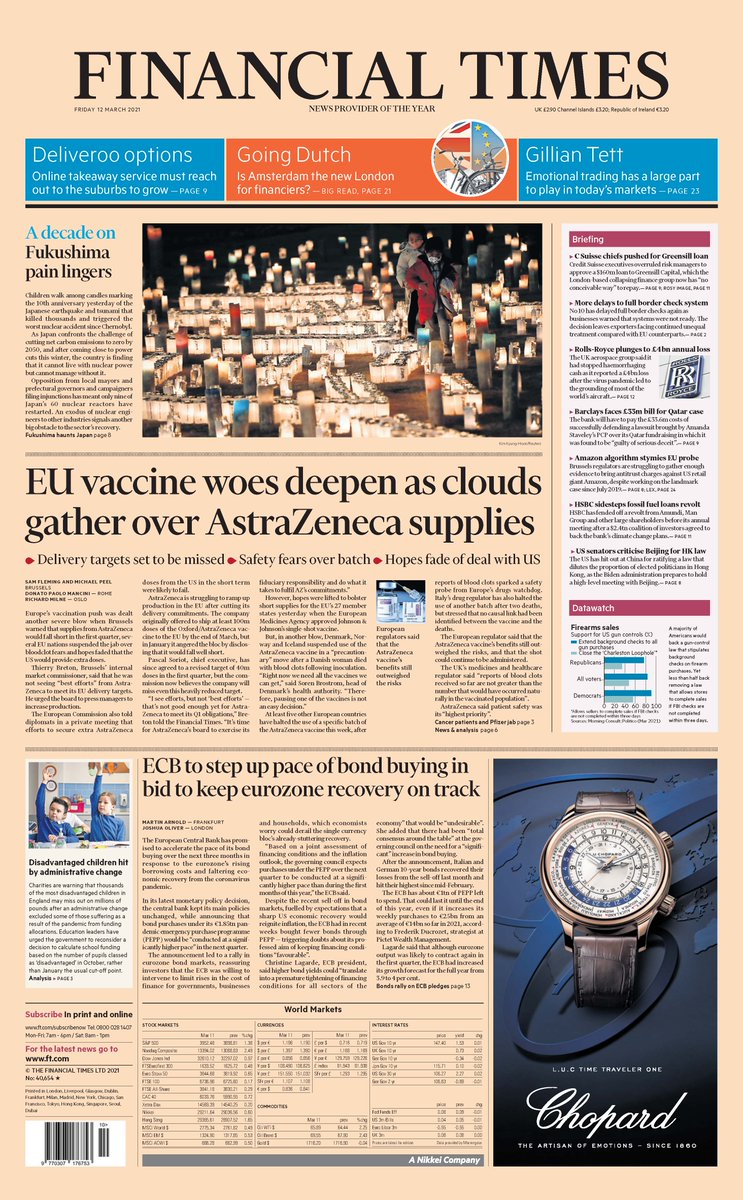 Europe’s deepening vaccine “woes” make the Financial Times’s splash, after Brussels warned that supplies from pharmaceutical firm AstraZeneca would fall short in the first quarter. The paper says it comes on top of several EU countries suspending use of the jab over bloodclot fears and what the paper says are fading hopes that the US will provide extra doses.