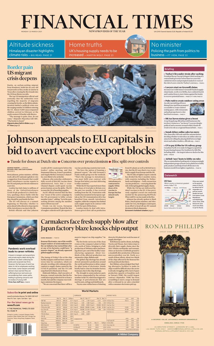 As it reports that Boris Johnson will make personal phone calls to selected European counterparts leaders to ask them not to support the export ban, the Financial Times’ sub-headline describes a “tussle” for millions of vaccine doses being made at a Dutch factory.