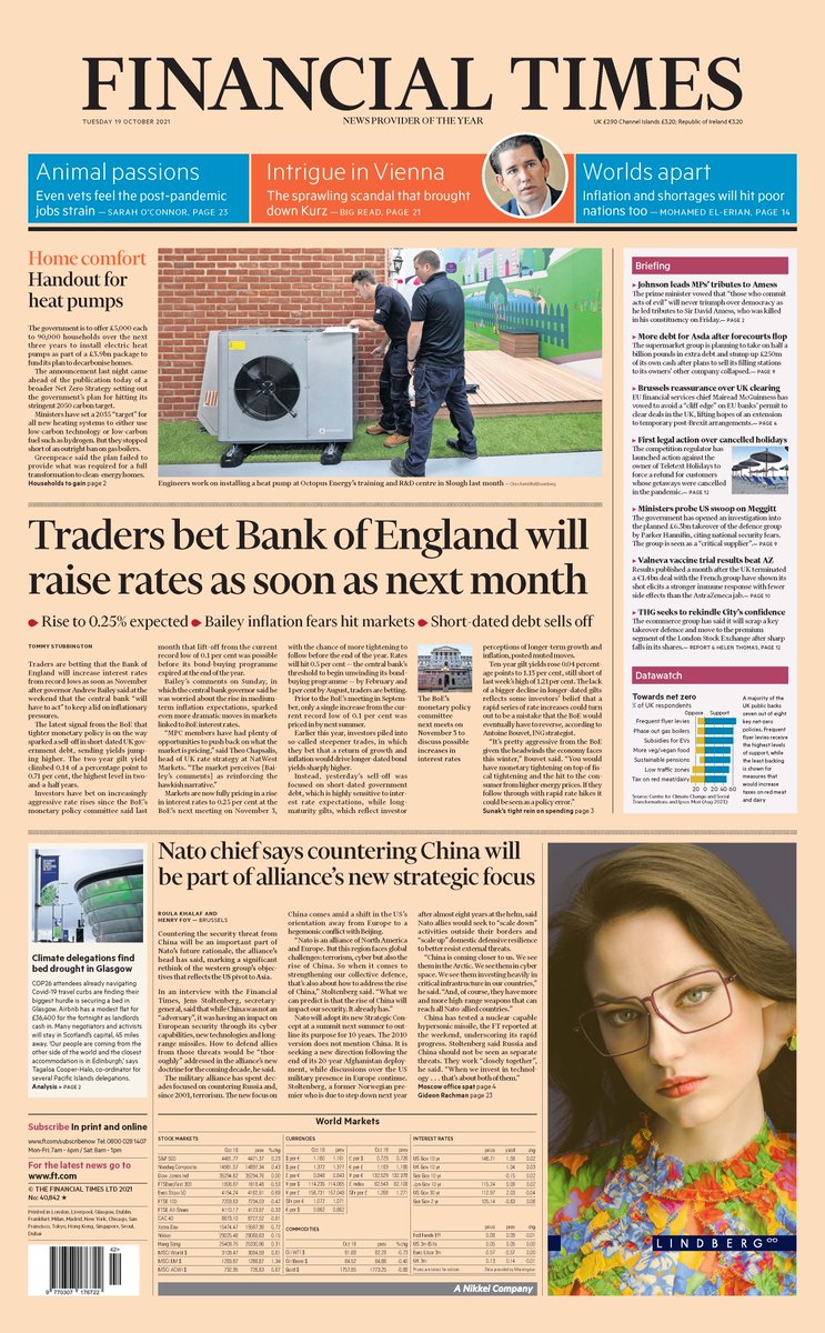 The Financial Times reports that a “tighter monetary policy is on the way”, with traders “betting that the Bank of England will increase rates from record lows as soon as November”. They think rates “will hit 0.5% – the central bank’s threshold to begin unwinding its bond-buying programme – by February and 1% by August”.