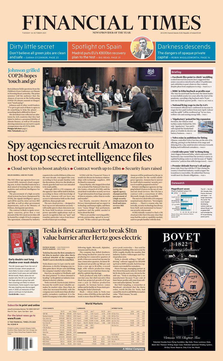 The Financial Times reports that the UK’s spy agencies have contracted Amazon’s cloud computing arm to host classified material in a deal “aimed at boosting the use of data analytics and artificial intelligence in espionage”. The paper says the deal – estimated to be worth between £500m and £1bn – is “likely to ignite sovereignty concerns” with most of the UK’s top secret data being held by a US tech company.