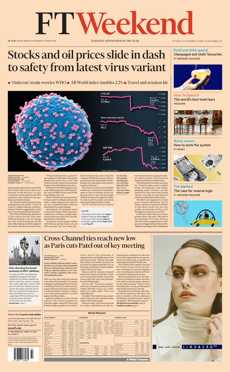 The Financial Times reports on a “dash to safety” on stocks and oil prices as a result of the latest news on the new Covid variant. It reports that oil prices and global stocks were hit by their “hardest falls” in more than a year following the discovery of the new coronavirus variant.