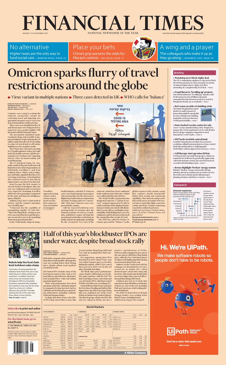 Restrictions on travel is the focus of the Financial Times as countries respond to the variant. The US, EU, UK, Australia, Saudi Arabia and South Korea have limited travel or ordered quarantines on those travelling to and from southern Africa, the paper points out. Switzerland has restricted travel to non-African nations where cases have been detected, and India and Singapore have indicated that they will review restrictions. Israel closed its borders to foreigners after one case was confirmed, the paper adds.