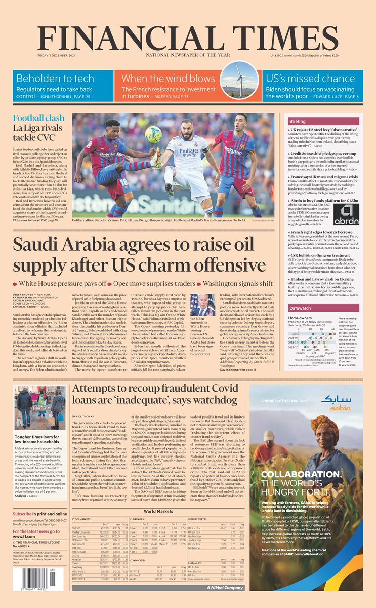 The Financial Times leads with a story on Saudi Arabia’s new agreement to raise oil supplies after a charm offensive by Biden administration officials. It also reports on the UK government’s attempt to recoup an estimated £5bn stolen during the pandemic via the Covid loan scheme for small businesses. According to a new report by the National Audit Office, the initiative by the Department for Business, Energy and Industrial Strategy is “inadequate”.