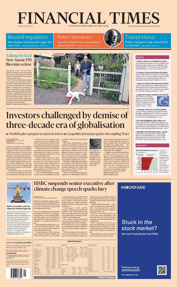 The Financial Times reports on concerns among company executives and investors that a “three-decade golden era for globalisation risks going into reverse”. The paper says that, as world leaders prepare to meet in Davos for the first time since the start of the pandemic, the war in Ukraine, global supply chain disruption, and a worsening economic outlook have left businesses “grappling with vital strategic decisions”.