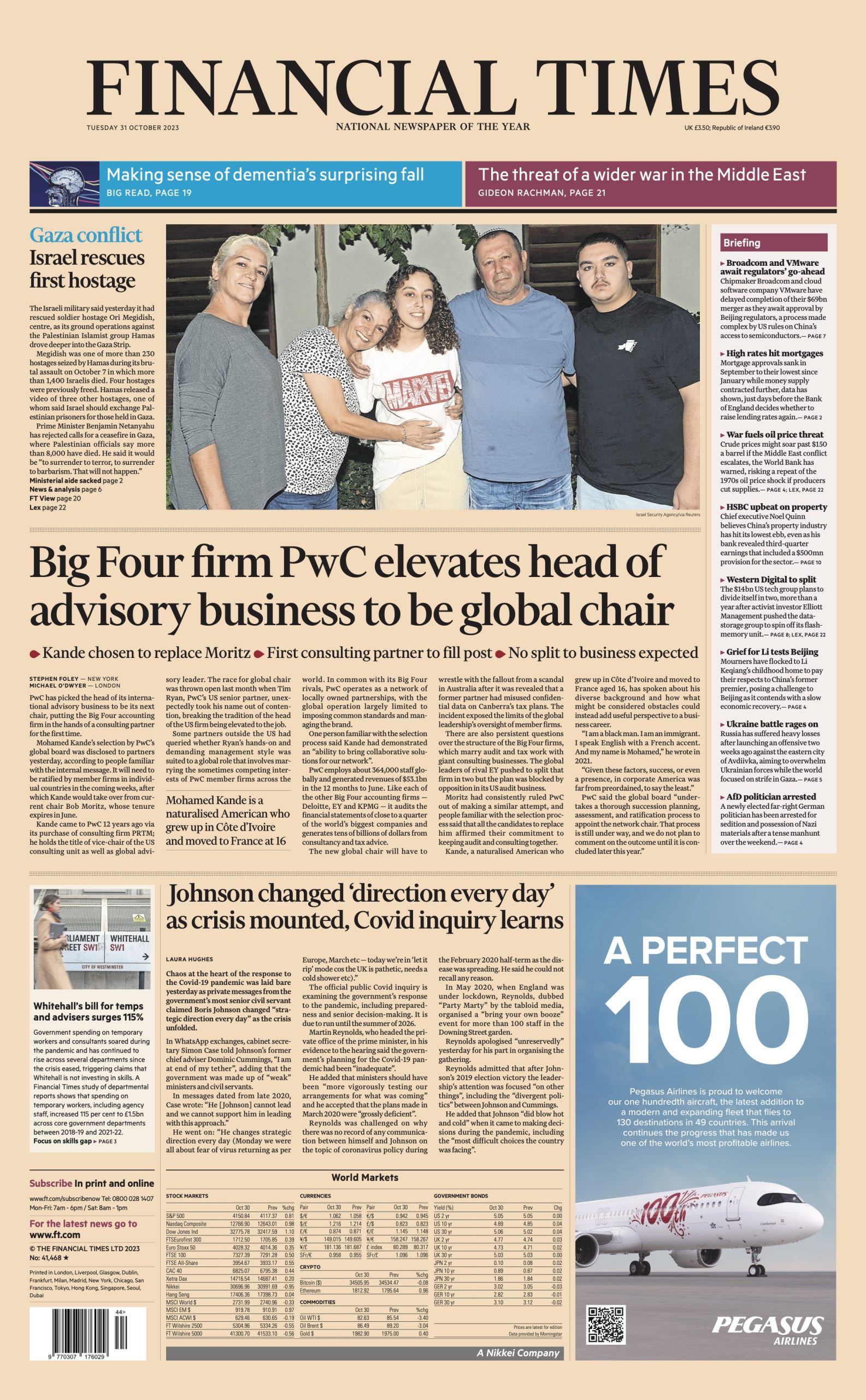 The Financial Times focuses on the news that the head of accounting giant PwC’s advisory business is set to become its next global chair. The paper also goes over Monday’s Covid inquiry hearing, in which disparaging WhatsApp messages sent by senior civil servants at the start of the pandemic were laid bare.