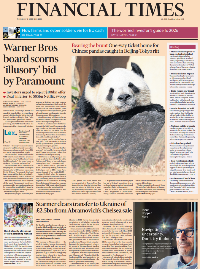 Warner Bros Discovery’s board rejected a $108bn approach from Paramount, calling it “illusory” and urging investors to spurn it. The directors said the bid lacked funding and regulatory certainty and was inferior to an $85bn transaction they are pursuing with Netflix.
