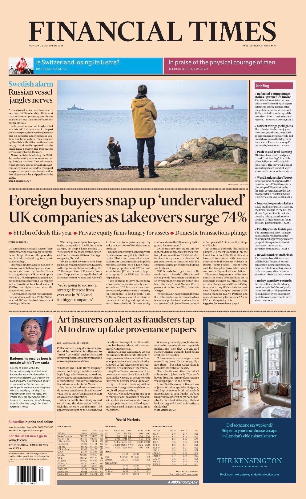 Overseas buyers are accelerating UK takeovers, up 74% this year to about $142bn, as assets are viewed as undervalued. Private equity is particularly active while domestic dealmaking has slumped. Advisers expect more bids next year, potentially targeting larger companies.