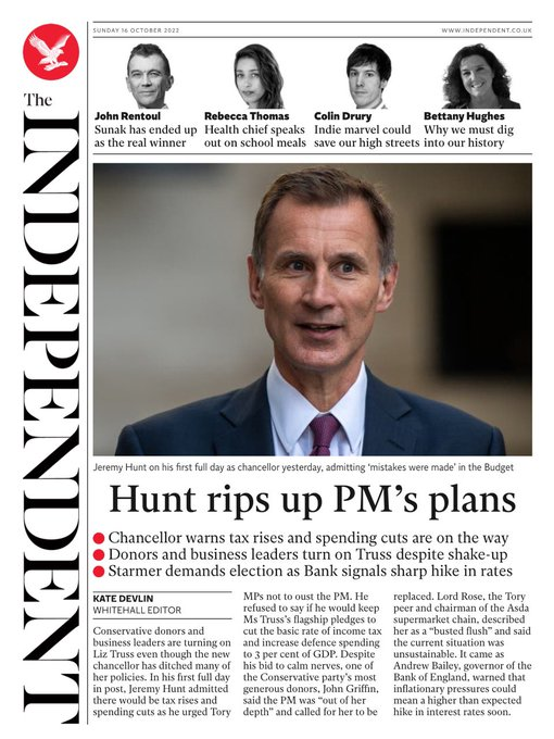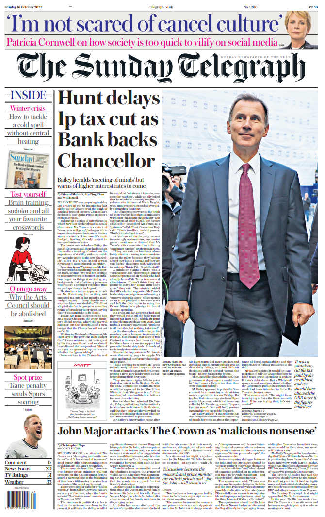 The Sunday Telegraph reports that Jeremy Hunt is preparing to delay Liz Truss’s 1p income tax cut.
