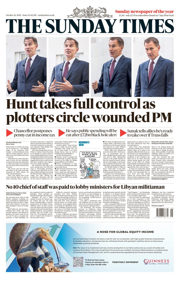 In the Sunday Times, Jeremy Hunt delays the penny cut to income tax while cabinet ministers warn that the prime minister’s term is up and backbenchers plot to unseat her.