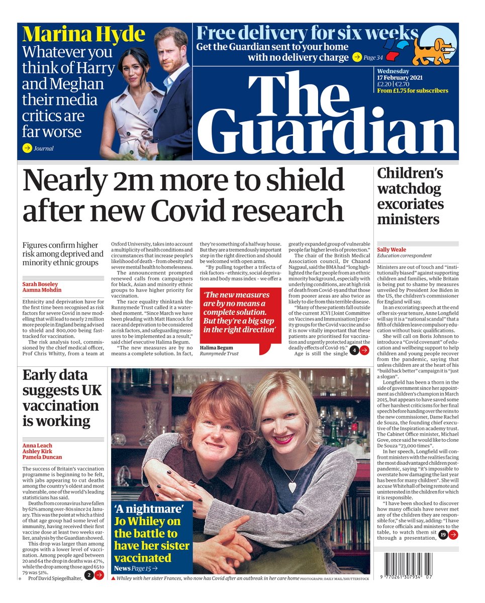 The government’s move to ask a further 1.7m people in England to shield from the virus leads the Guardian. The paper says that – for the first time – ethnicity and deprivation have been recognised as risk factors for severe Covid. Separately, the paper pictures BBC radio DJ Jo Whiley who has spoken of the battle to secure a vaccine for her sister.