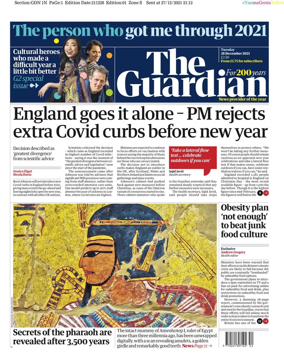 The Guardian leads with “England goes it alone”, pointing out that Wales, Scotland and Northern Ireland have all tightened rules. It also quotes critical scientists who label it as the moment that has provided “the greatest divergence between scientific advice and legislation”. Elsewhere on the front page, the paper pictures the “intact” mummy of Amenhotep I, ruler of Egypt 3,500 years ago