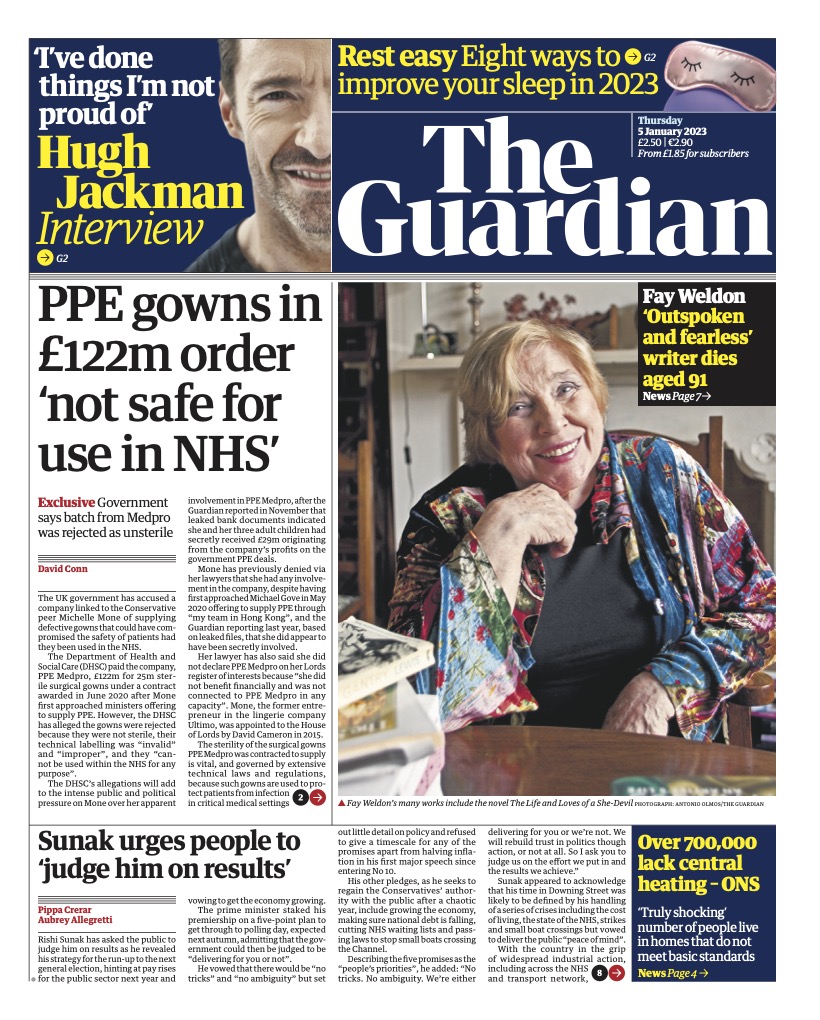 The Guardian leads with an exclusive report, which says “the UK government has accused a company linked to the Conservative peer Michelle Mone of supplying defective gowns that could have compromised the safety of patients had they been used in the NHS”. The Department of Health and Social Care has alleged the gowns were rejected because they were not sterile, the paper adds. In its report the Guardian says Ms Mone has previously denied via her lawyers that she had any financial benefit from the company.