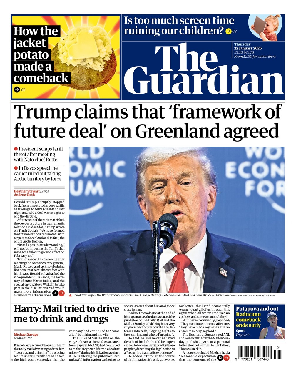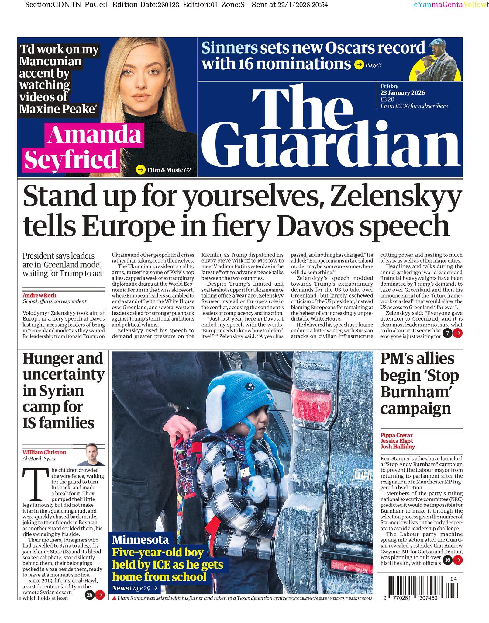 Guardian Front Page 23rd of January 2026
