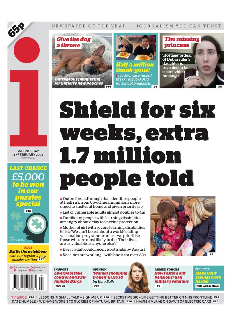 A breakthrough by experts at Oxford University helped to identify the near 2m people who must now shield, the i paper reports. The move doubles the list of vulnerable adults in England, it adds. Meanwhile, the paper reports anger from families of people with learning disabilities about delays to vaccine protection.