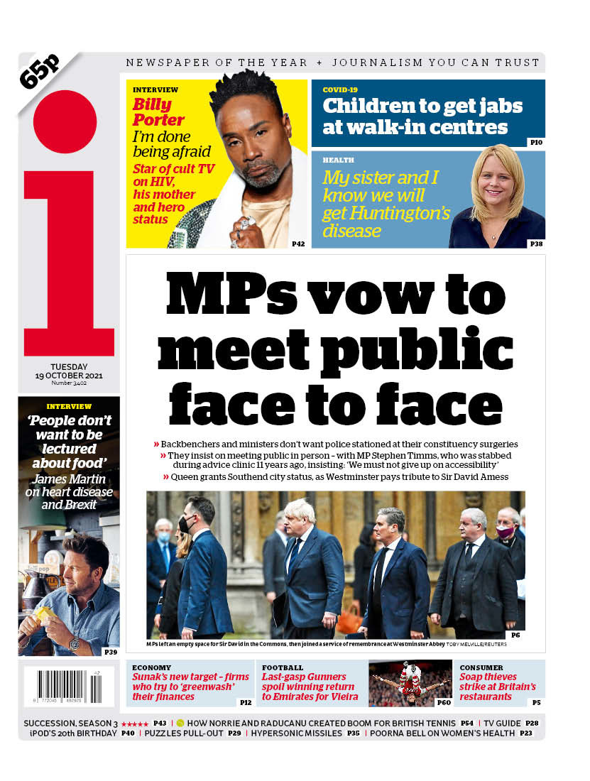 The i shows the three political leaders walking in a line outside of the church, and reports that MPs are insisting they will still meet members of the public in person without police present. Stephen Timms, the Labour MP who was stabbed at his constituency surgery in 2010, says “we must not give up on accessibility”, the paper reports.