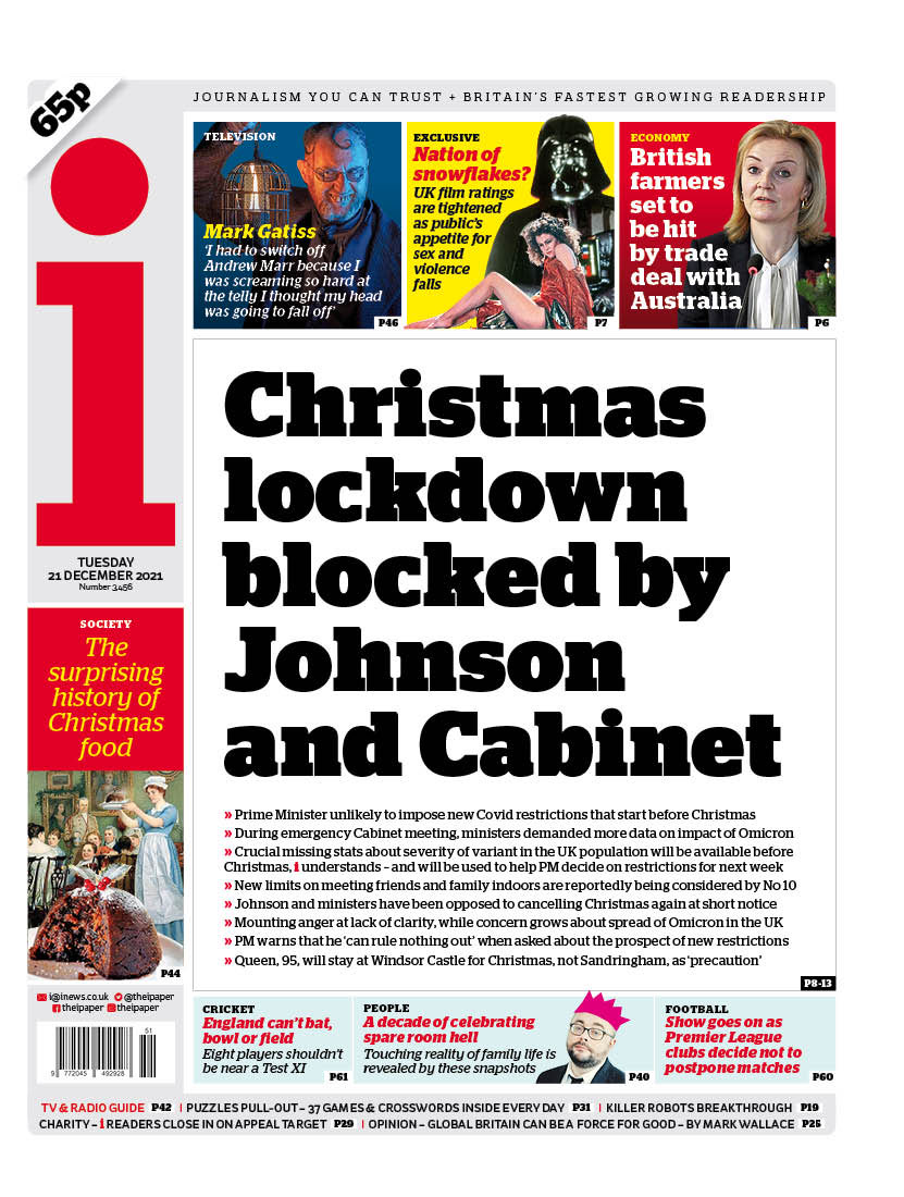 Many of the papers focus on government discussions over whether to impose further Covid restrictions in response to the Omicron variant. The I headlines on “Christmas lockdown blocked by Johnson and cabinet” as it says that ministers demanded more data on the impact of Omicron during an emergency meeting. It says Prime Minister Boris Johnson is unlikely to impose restrictions before 25 December, but the paper understands that missing statistics about the severity of the variant will be available before then.