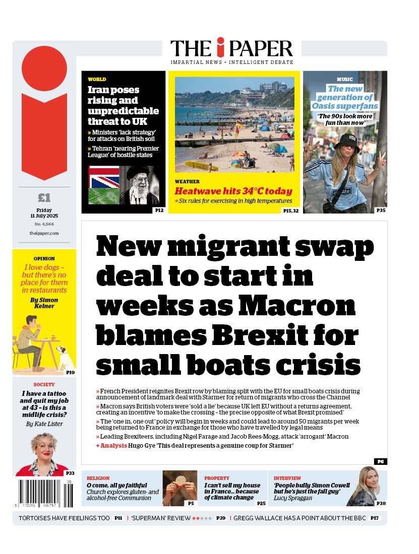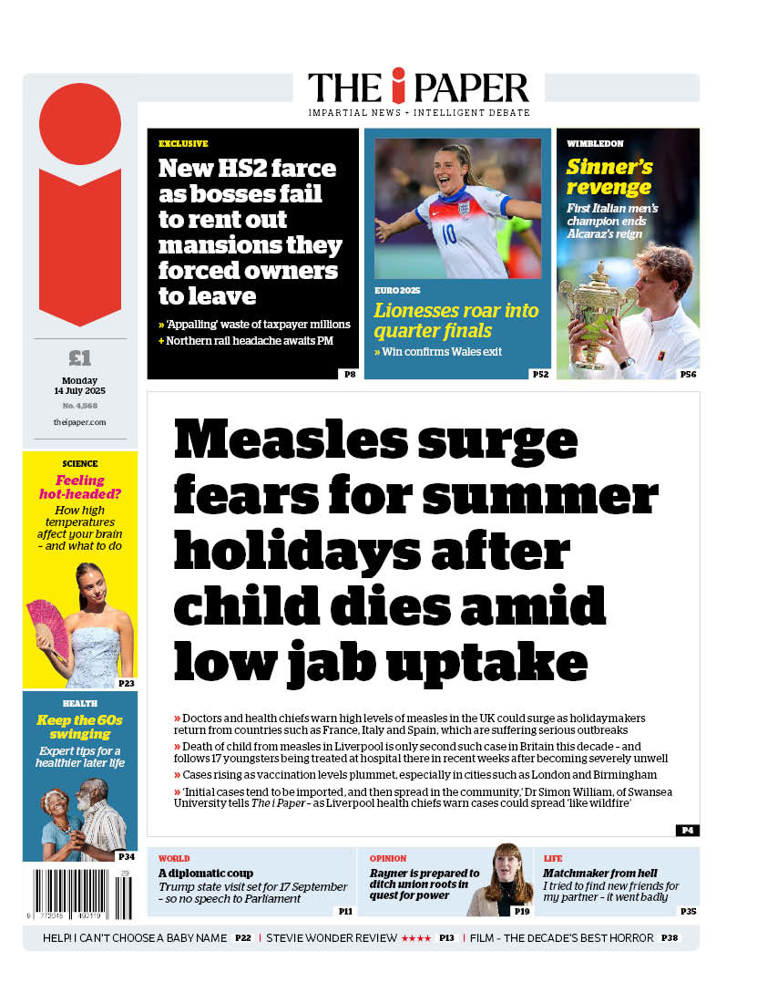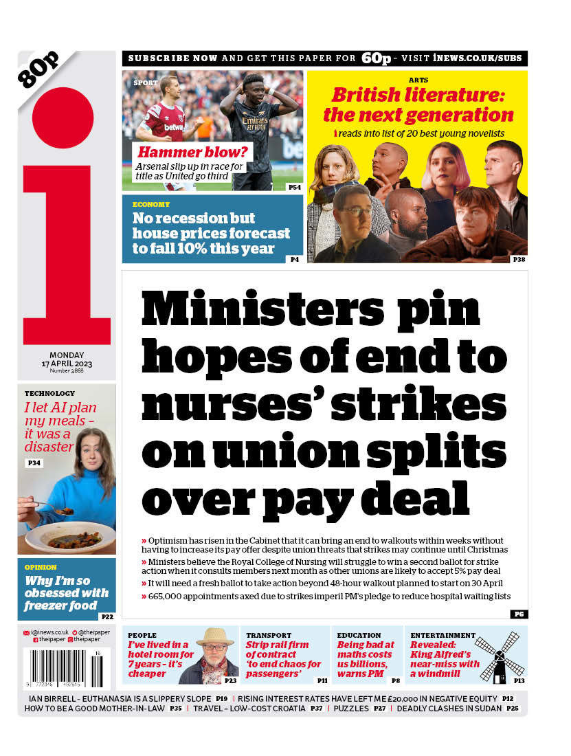 The i reports that government ministers are “optimistic” the nurses’ strike can be brought to an end without having to increase their pay offer. It says cabinet members believe that the RCN will face difficulties winning a second ballot for strike action due to a “split” within unions over whether or not to accept a 5% pay deal. The front page also previews an article inside its pages from one of its writers who used Artificial Intelligence to plan her meals – the result was a “disaster”, it says.