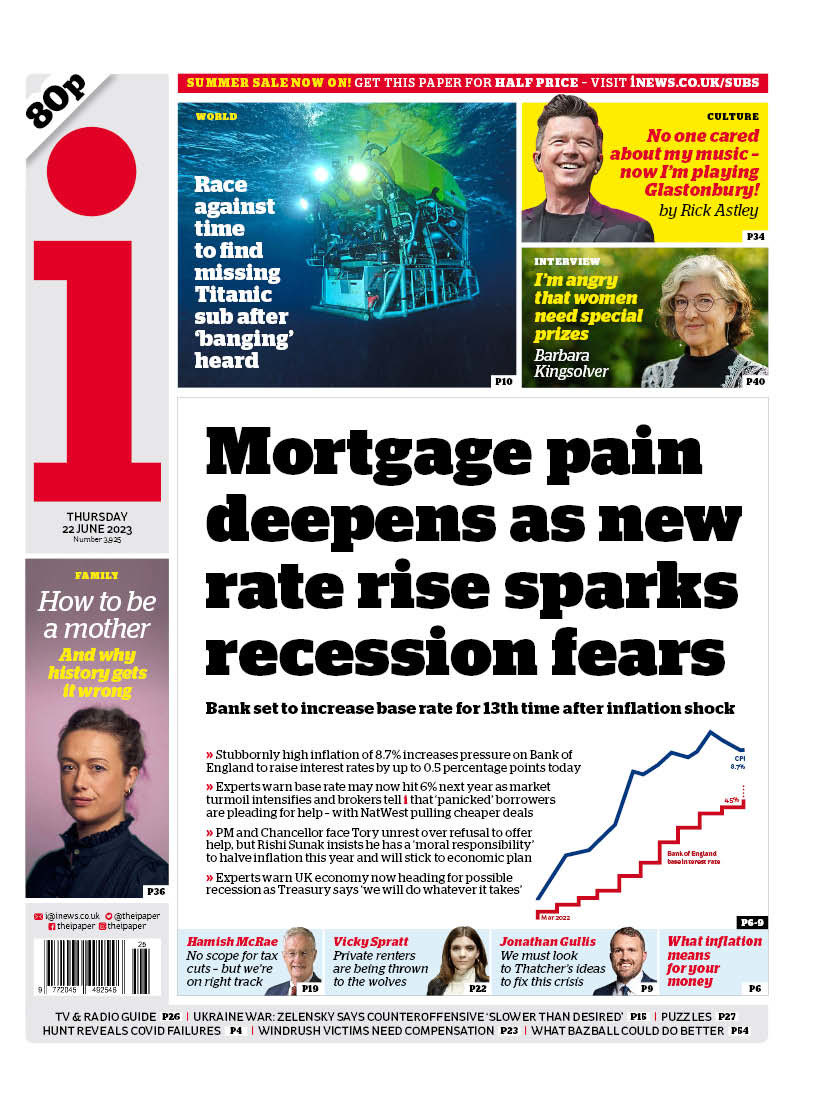 The i newspaper reports on deepening “mortgage pain” as the Bank of England’s expected interest rate rise “sparks new recession fears”. The assumption is that interest rates will rise by 0.25% to 4.75% today but some are suggesting they could go up to 5%. Rising rates mean homeowners are facing big increases in mortgage payments – and the paper reports “panicked” borrowers are pleading for help from mortgage brokers.