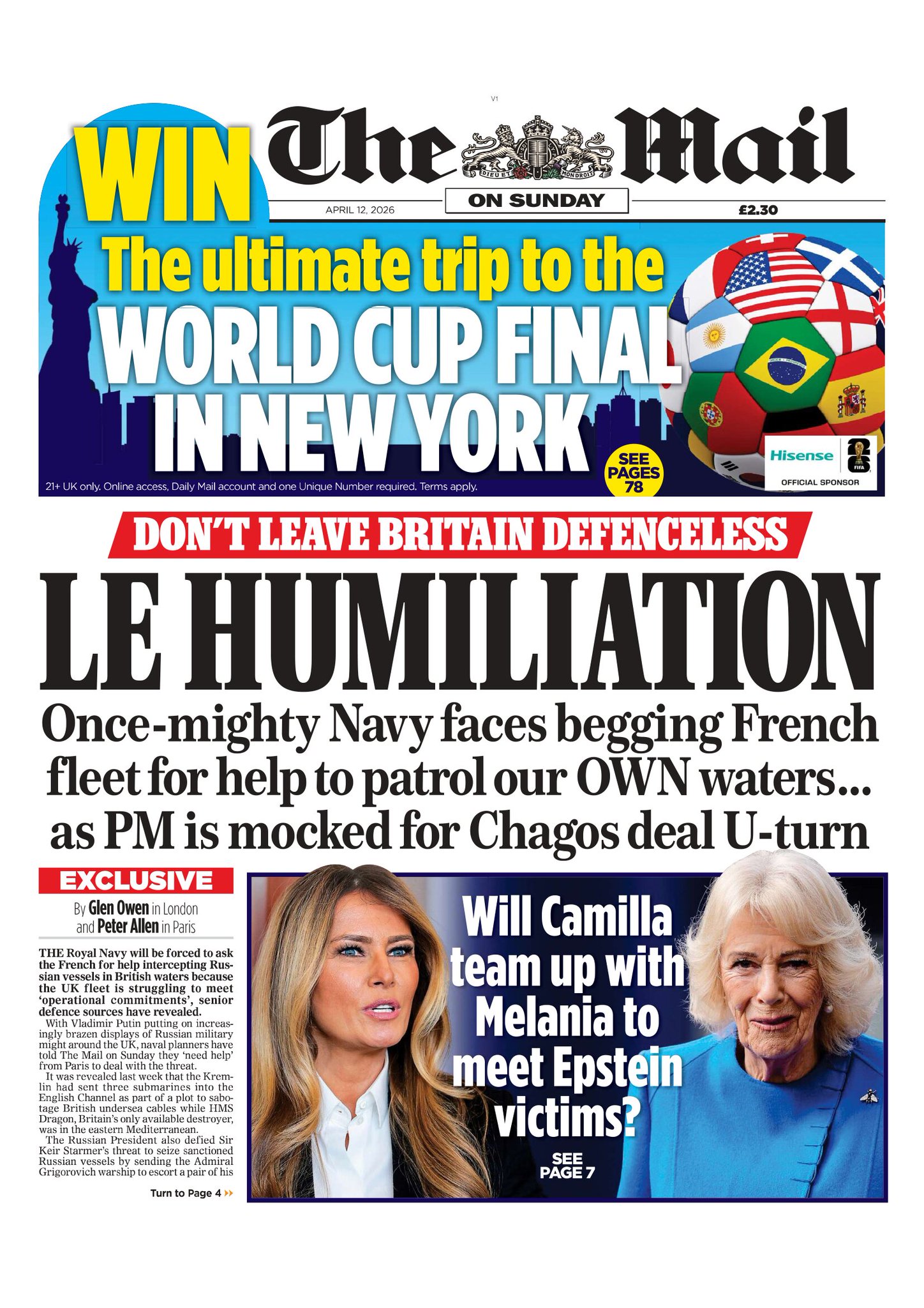 Mail on Sunday Front Page 12th of April 2026