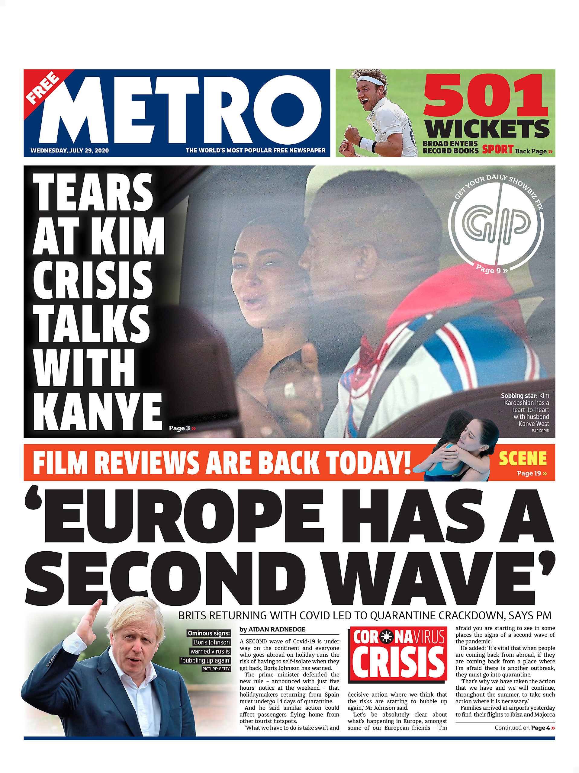 A “second wave” of Covid-19 is already under way in Europe, is how the Metro has reported the PM’s remarks. It says Mr Johnson also defended the decision to make holidaymakers returning from Spain have to undergo quarantine, adding that similar action could soon be taken for people flying home from other tourist hotspots.