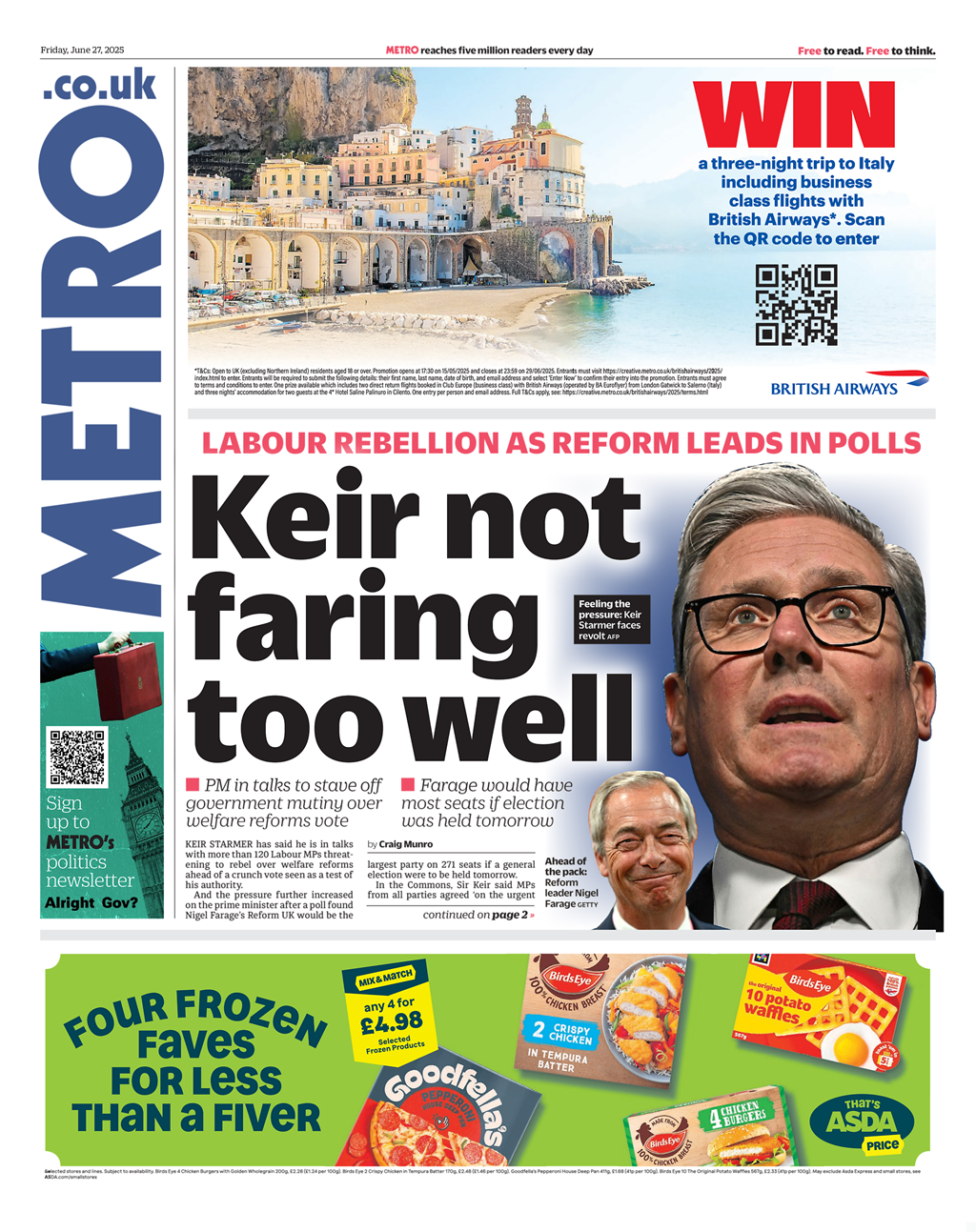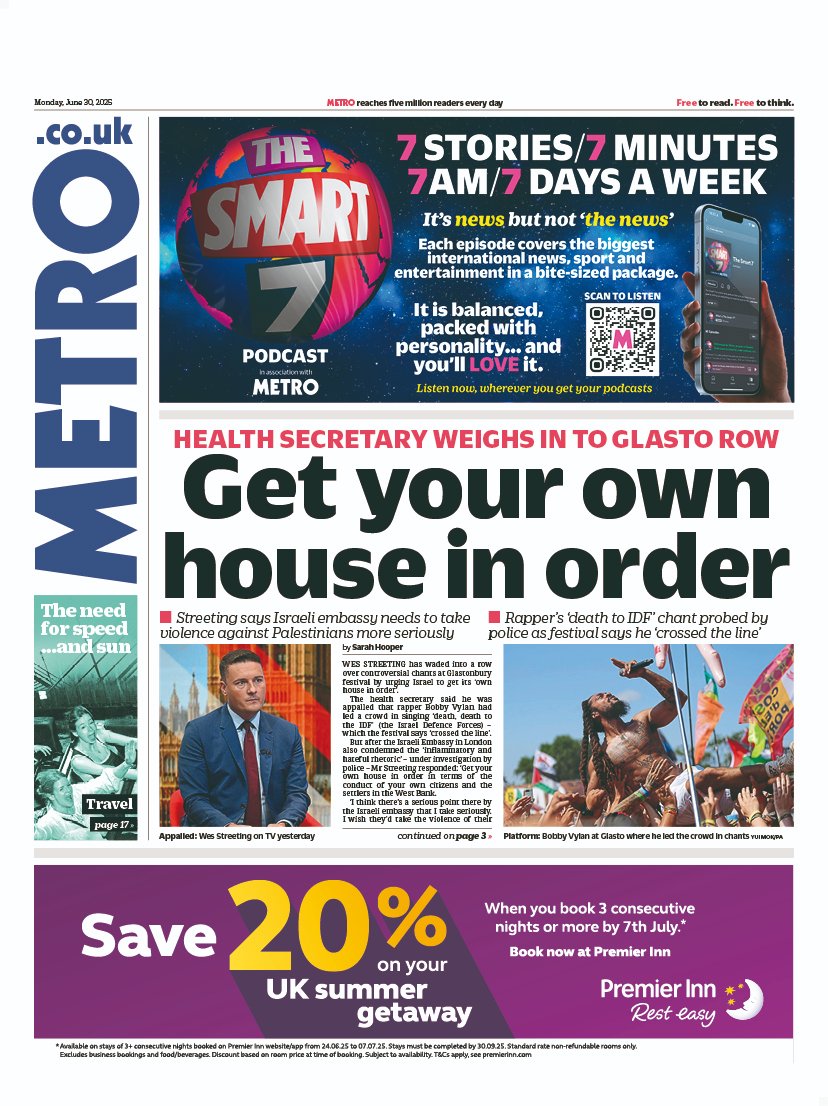 And Metro likens ordering the over 50s to stay put to being “grounded”. The paper also lists other potential “nuclear” options if cases rise, such as London being sealed off, with the M25 ring road used as a “border”. Meanwhile, the picture dominating the front page is that of Lewis Hamilton celebrating at Silverstone after winning his seventh British Grand Prix.