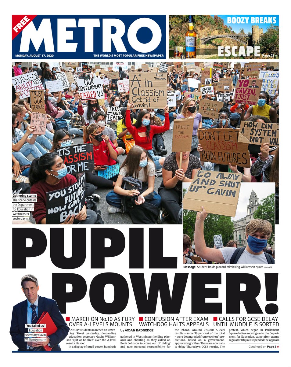 “Pupil power” is the headline on the front of Metro, with images of students demonstrating outside the Department for Education in Westminster on Sunday dominating the page. Hundreds of students took to the streets protesting against the government’s mishandling of exam results, with many demanding Education Secretary Gavin Williamson stands down. As they gathered in Westminster, they called on Boris Johnson to “come out of hiding”, the paper adds, and take personal responsibility for the “chaos”.