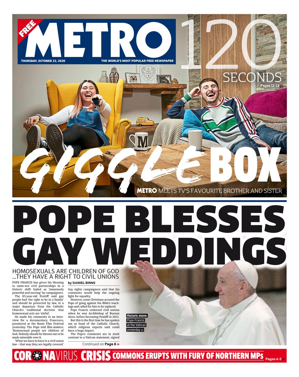Metro’s front page focuses on what it calls a “historic shift” by Pope Francis to support civil partnerships for same-sex couples. The paper says gay rights campaigners hailed his words as “immensely poweful and moving”, adding that they would help in the ongoing fight for equality.