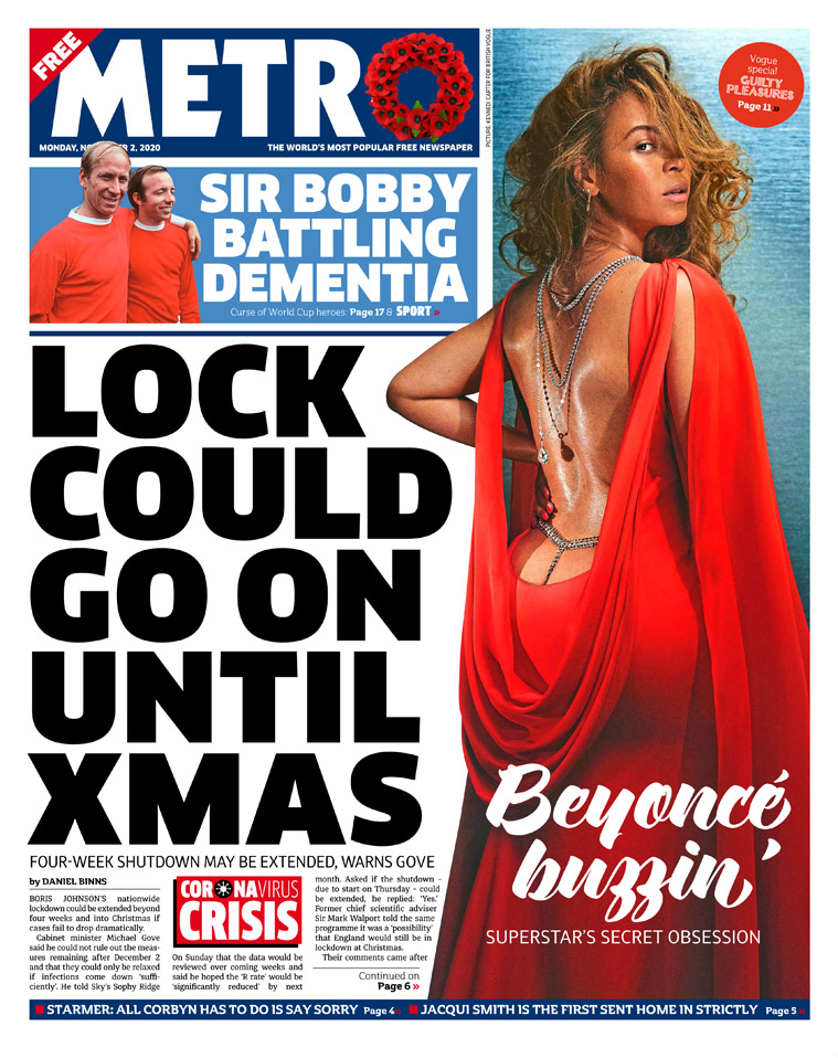 Metro also leads on the news that England’s lockdown could by extended beyond the four weeks and into Christmas if cases do not fall dramatically.