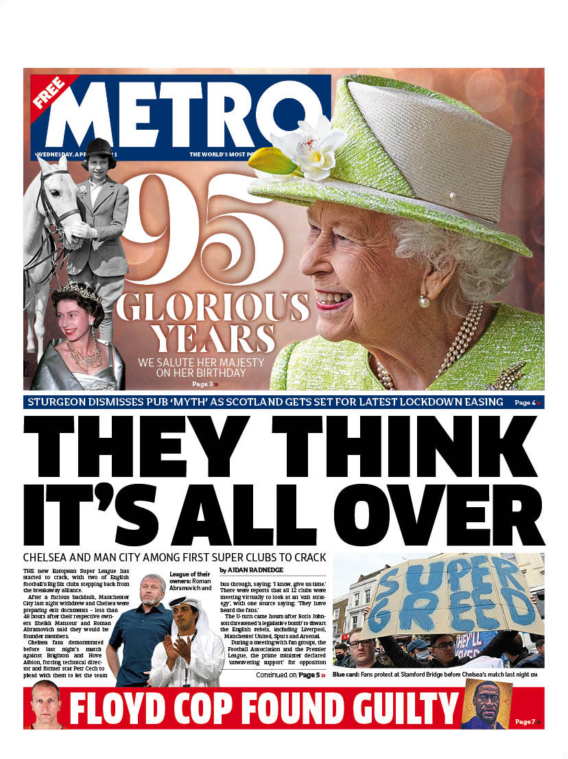 The Metro reports that the prime minister “defended” Baroness Dido Harding, head of NHS test and trace, despite “contact tracing falling to a record low” and Kate Bingham, who chairs the UK Vaccine Taskforce, after she was “accused of revealing confidential information to US financiers”. The government says “inaccuracies are being addressed” with the Sunday Times over the report. The Metro’s front page also features a picture of actor Johnny Depp and his ex-wife Amber Heard, after a judge found that 12 of 14 alleged incidents of domestic violence had occurred.