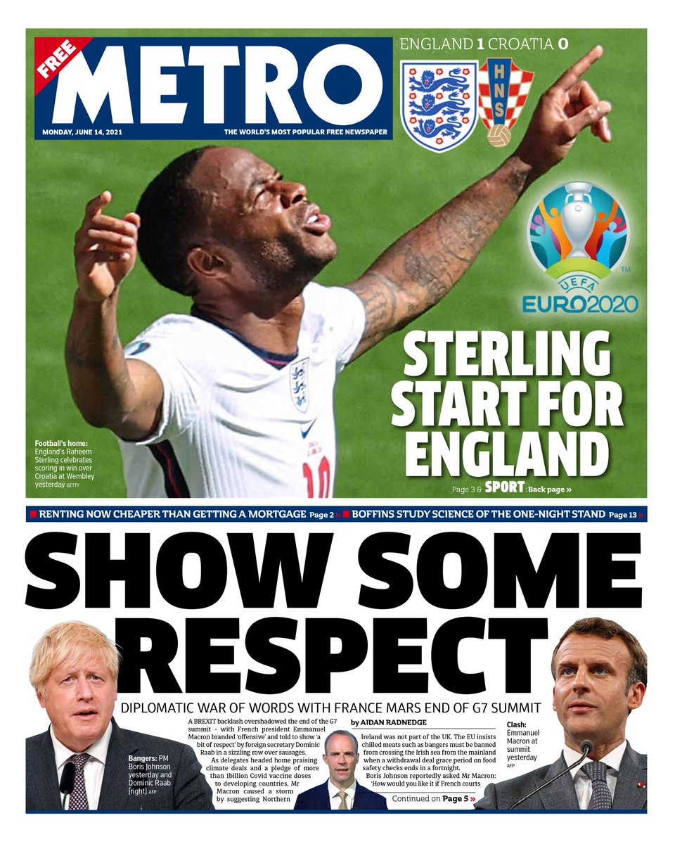 The end of the summit in Cornwall was overshadowed by a Brexit backlash, the Metro says, after French President Emmanuel Macron was branded “offensive” and told to show “a bit of respect” in a row about Northern Ireland. Mr Macron caused a “storm” by suggesting Northern Ireland was not part of the UK.