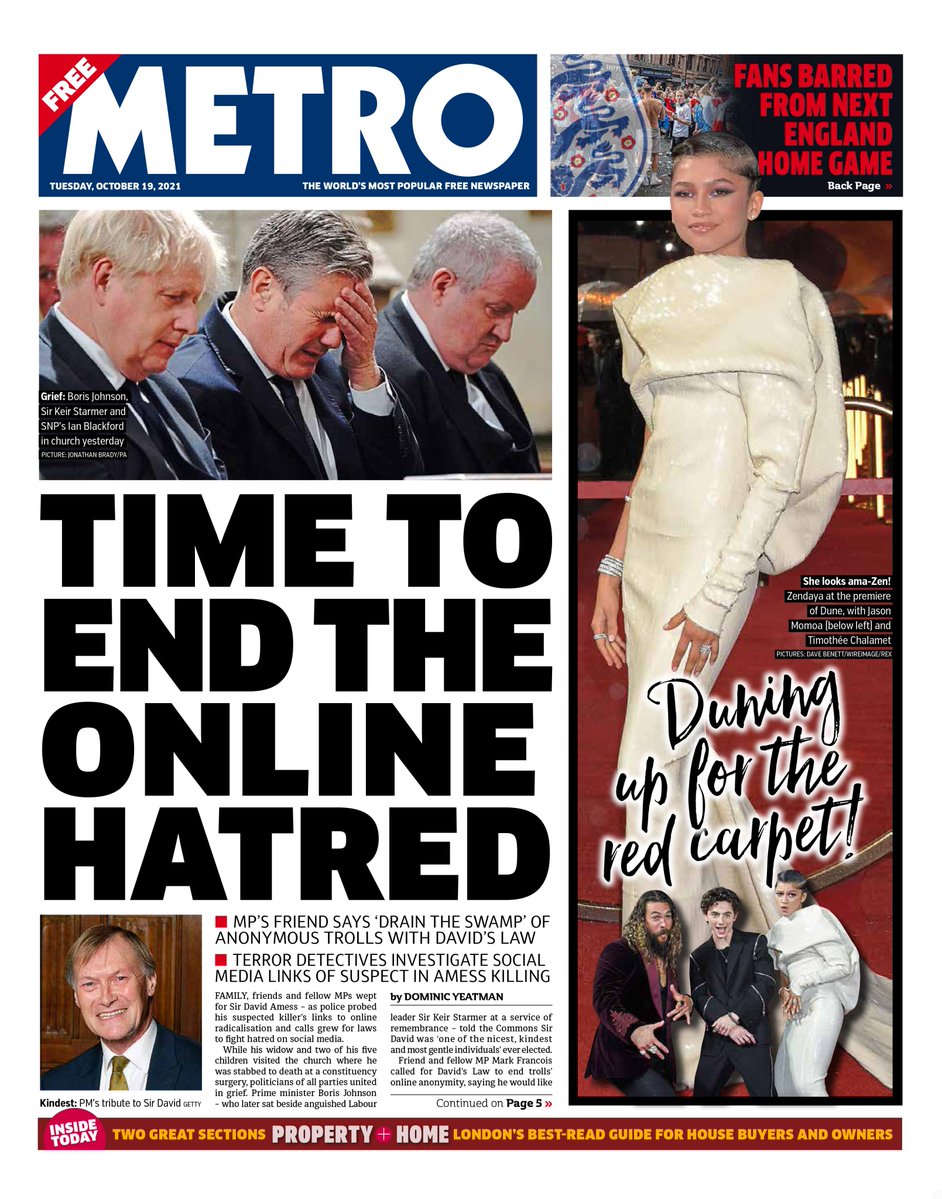 The Metro features a picture of Prime Minister Boris Johnson, Labour leader Sir Keir Starmer and the SNP’s Westminster leader Ian Blackford at a remembrance service for Sir David. It says Sir Keir, photographed with his head in his hands, was “anguished”, and that “politicians of all parties united in grief”.