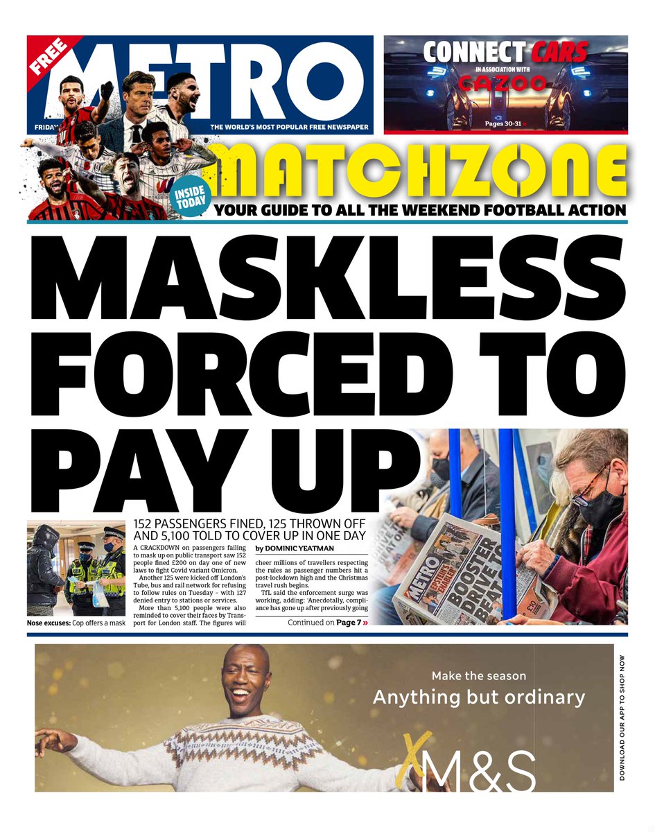 The Metro headlines with “maskless forced to pay up”. It reports that according to Transport for London, 152 passengers were fined, a further 125 were kicked off services and 5,100 people were reminded to cover their faces by TfL staff on the first day of a crackdown on masks. It comes after face coverings were made mandatory on public transport in England.