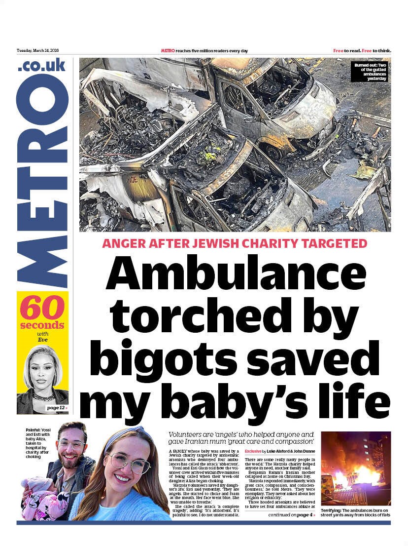 A fire destroyed ambulances at a Jewish medical charity in London, which police are treating as a suspected hate crime. A family whose baby previously received lifesaving care praised the volunteers’ compassion and support for all communities. Police appeals and inquiries continue.