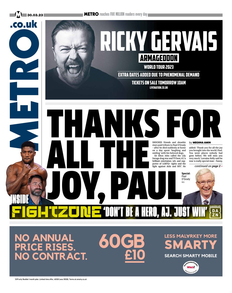 “Thanks for all the joy, Paul” headlines the Metro as it pays tribute to the TV presenter and comedian Paul O’Grady who died on Tuesday. It quotes a tribute from singer Sir Elton John who described the star as “a brilliant entertainer”.