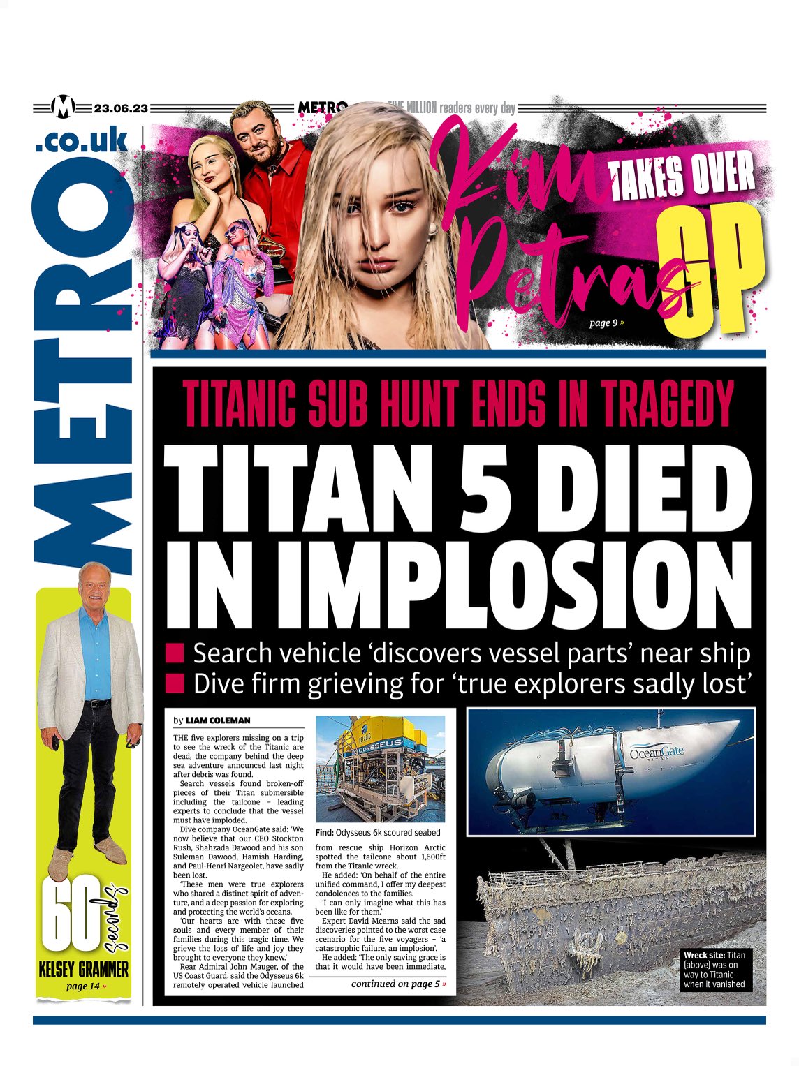 The Metro headlines on “Titan 5 died in implosion”. On Thursday evening, the US Coast Guard said the crew died following a catastrophic implosion, as five parts of the submersible were found on approximately 1,600ft (500m) from the bow of the Titanic wreck.