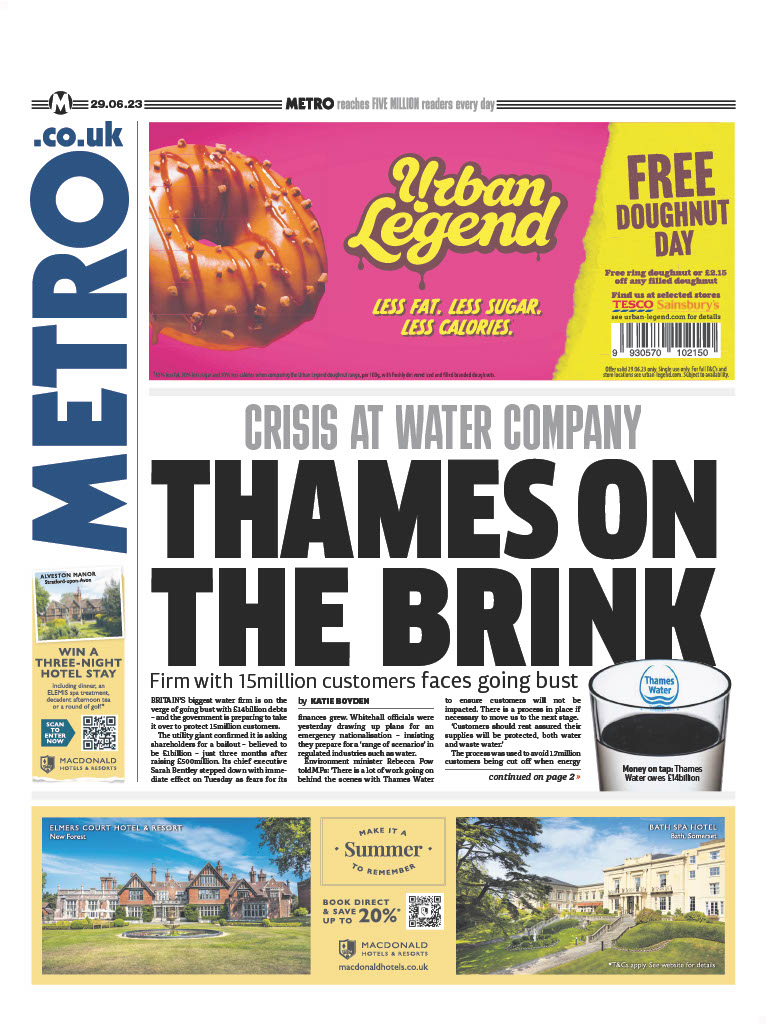 A number of Thursday’s papers lead with the news that Thames Water, the UK’s largest water company, could be on the verge of collapse. The Metro says the company has £14bn in debts and is believed to be trying to raise £1bn from its shareholders as part of a bailout.