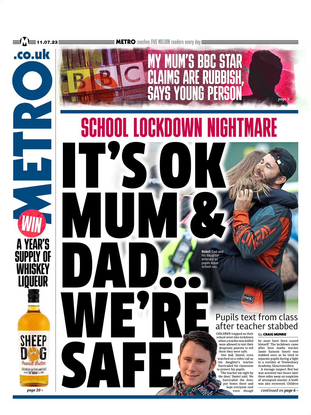 Metro leads on the Tewkesbury school stabbing on Monday, in which a boy was arrested as part of an attempted murder inquiry. The newspaper reports that school pupils were allowed to text their parents that they were safe as the school went into lockdown to protect the injured teacher, who was discharged from hospital on Monday evening.
