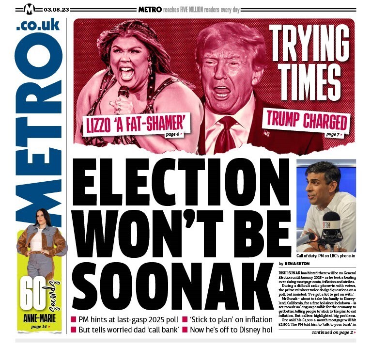 Pop star Lizzo and Donald Trump dominate the top of the Metro as the paper reports on the lawsuit filed against the singer and fresh charges levelled against the former president. The paper leads with Rishi Sunak hinting he may not call a general election before January 2025 – in comments made during a LBC listener phone-in. One of the four bullet points on the front page says the prime minister is going to Disneyland with wife and daughters for first ‘proper’ holiday in years.