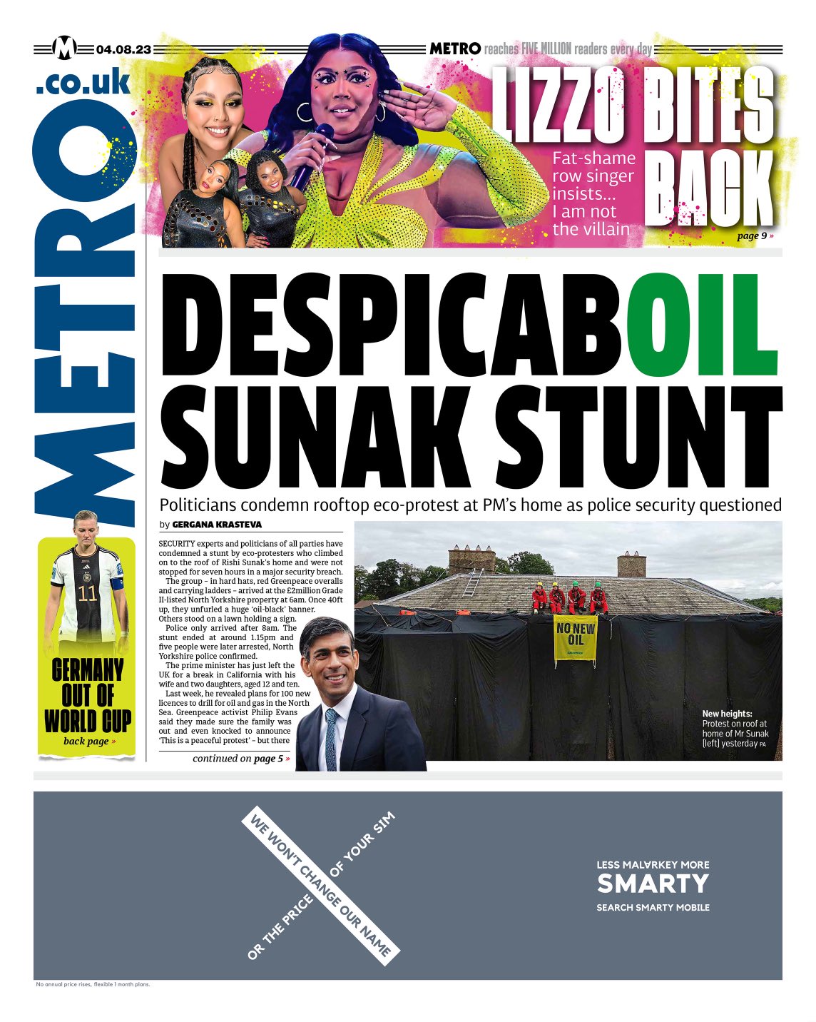 Surrounded by an array of colours, US pop star Lizzo catches the eye at the top of the Metro, saying she is “not the villain” after allegations by three ex-dancers of sexual harassment and creating a hostile work environment. The lead story in the paper centres around a security breach at Rishi Sunak’s North Yorkshire home after protesters were spent hours on its roof.