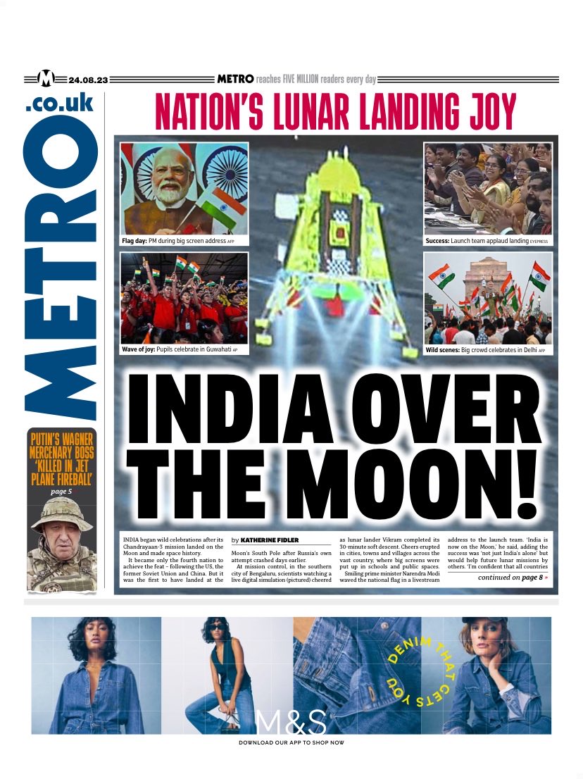 “India over the Moon,” headlines the Metro as it reports on the country becoming the first to land in the lunar south pole region. A picture of the live simulation of Chandrayaan-3’s lander on the Moon’s surface covers the front page. The paper writes the nation is only the fourth to land successfully on the Moon.