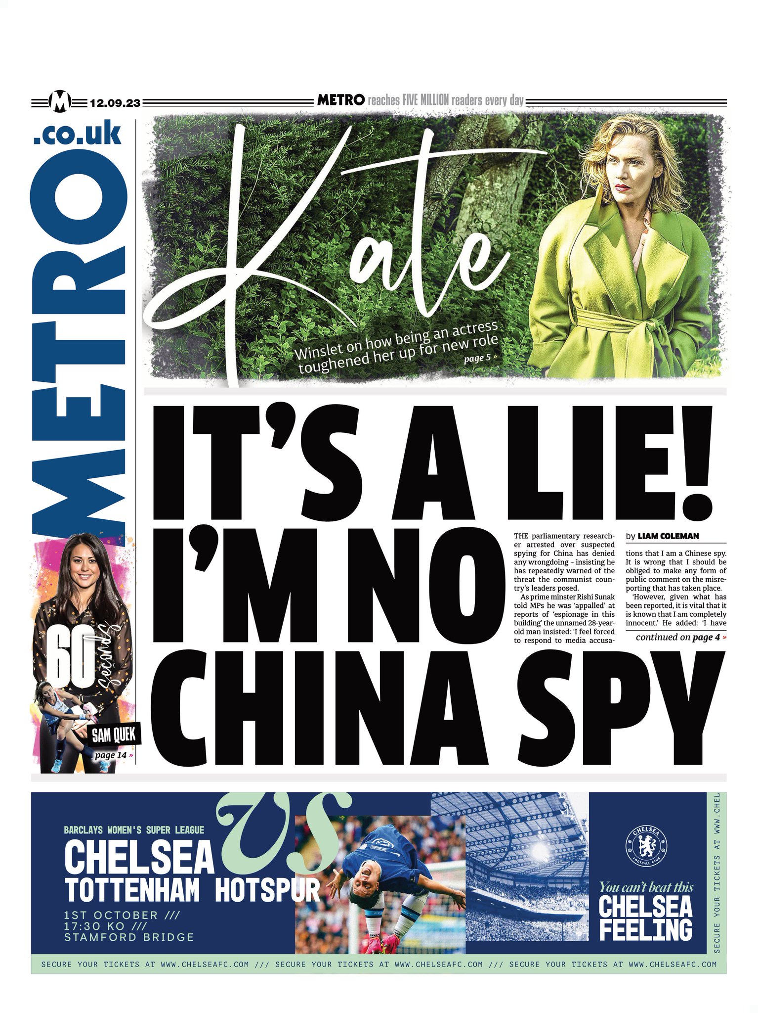 “It’s a lie! I’m no China spy” is the Metro’s headline on Tuesday, as the paper reports on a denial from one of the parliament researchers, who says he is “completely innocent”. The BBC is not naming the individual as he has not been charged following arrest.