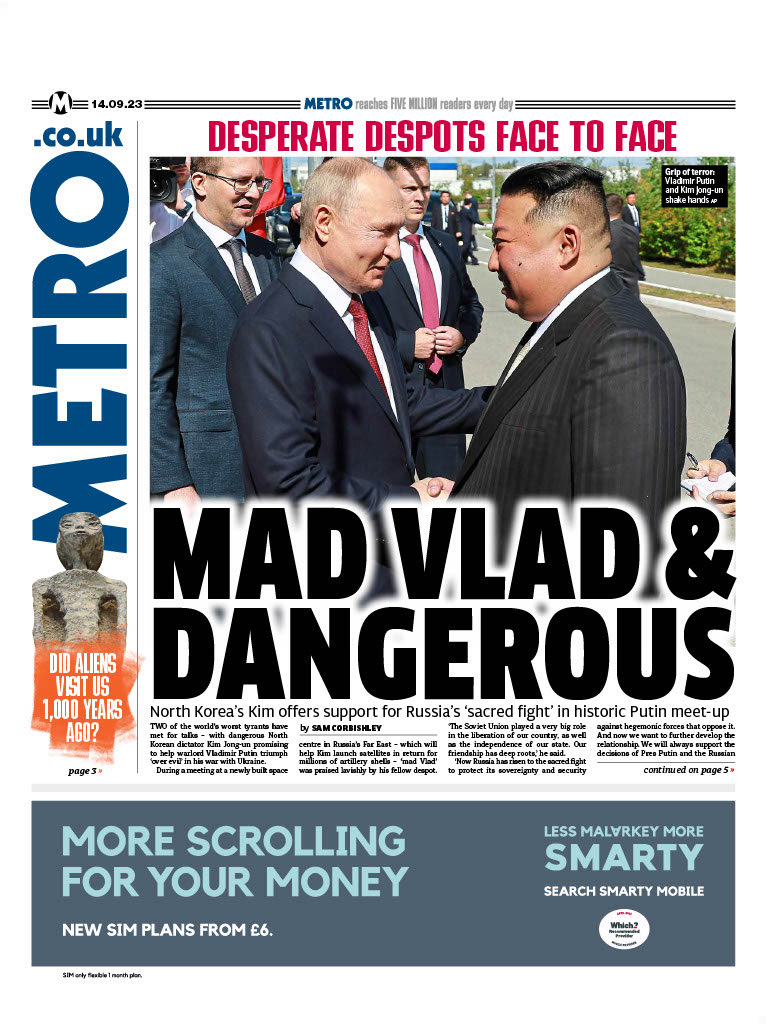 “Mad Vlad & Dangerous” is the Metro’s headline. The paper says “two of the world’s worst tyrants have met for talks”, as it claims the North Korean leader is “promising to help warlord Vladimir Putin triumph ‘over evil'”. It quotes Kim Jong Un as saying that his country will “always support the decisions of Pres Putin”.