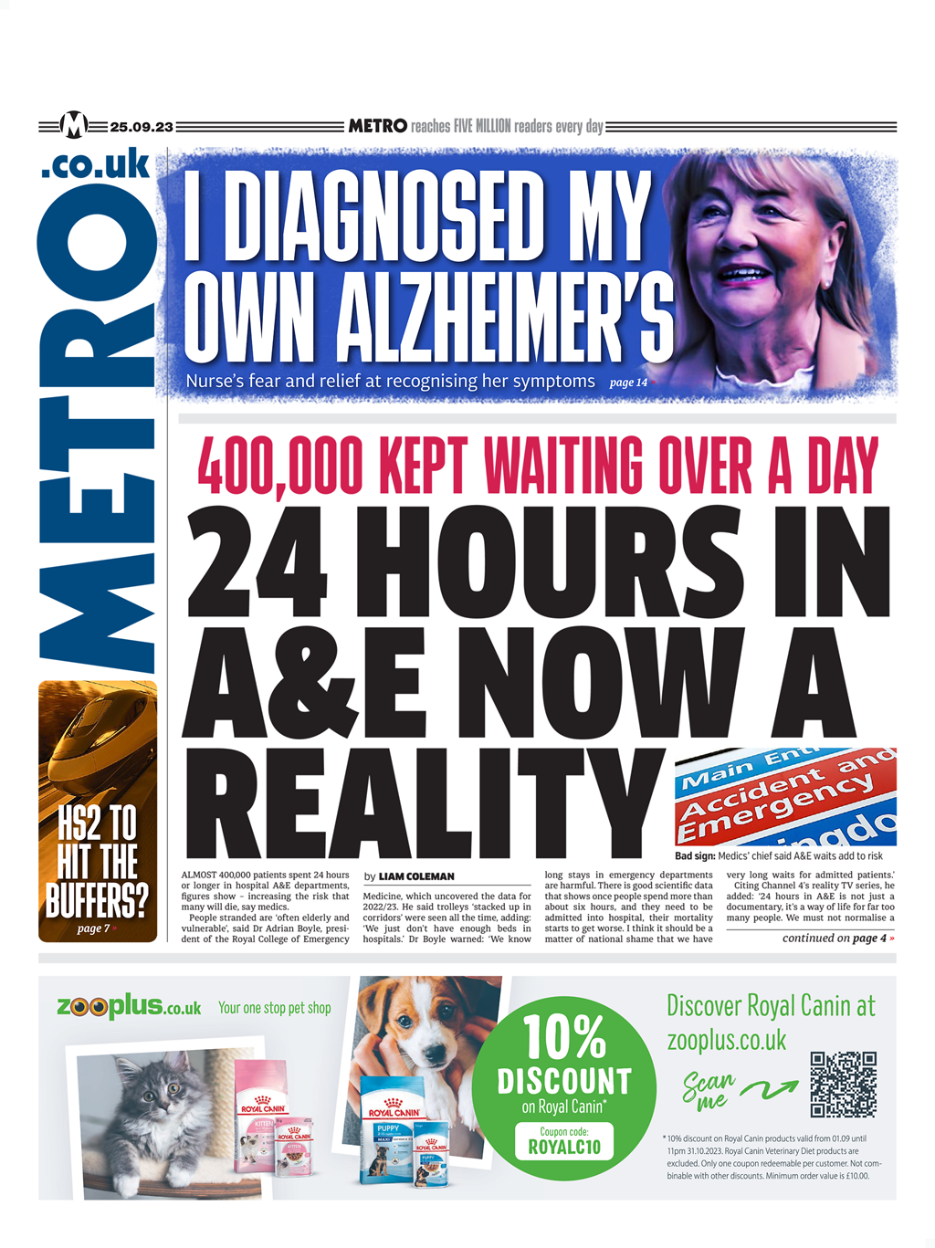 The Metro says that almost 400,000 patients that go to A&E in England end up waiting 24 hours or longer to be seen. The paper highlights figures for 2022-23 from the Royal College of Emergency Medicine and a doctor’s comments that longer A&E waits are harmful and increase mortality.