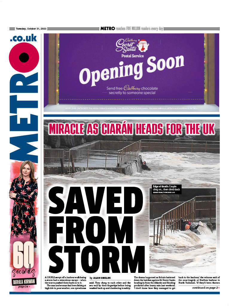 The Metro’s front page tells the story of a Yorkshire couple who got swept into the sea only to be “miraculously” pushed back on land by a wave. The paper says more rain is predicted to batter Britain when Storm Ciaran hits later this week.