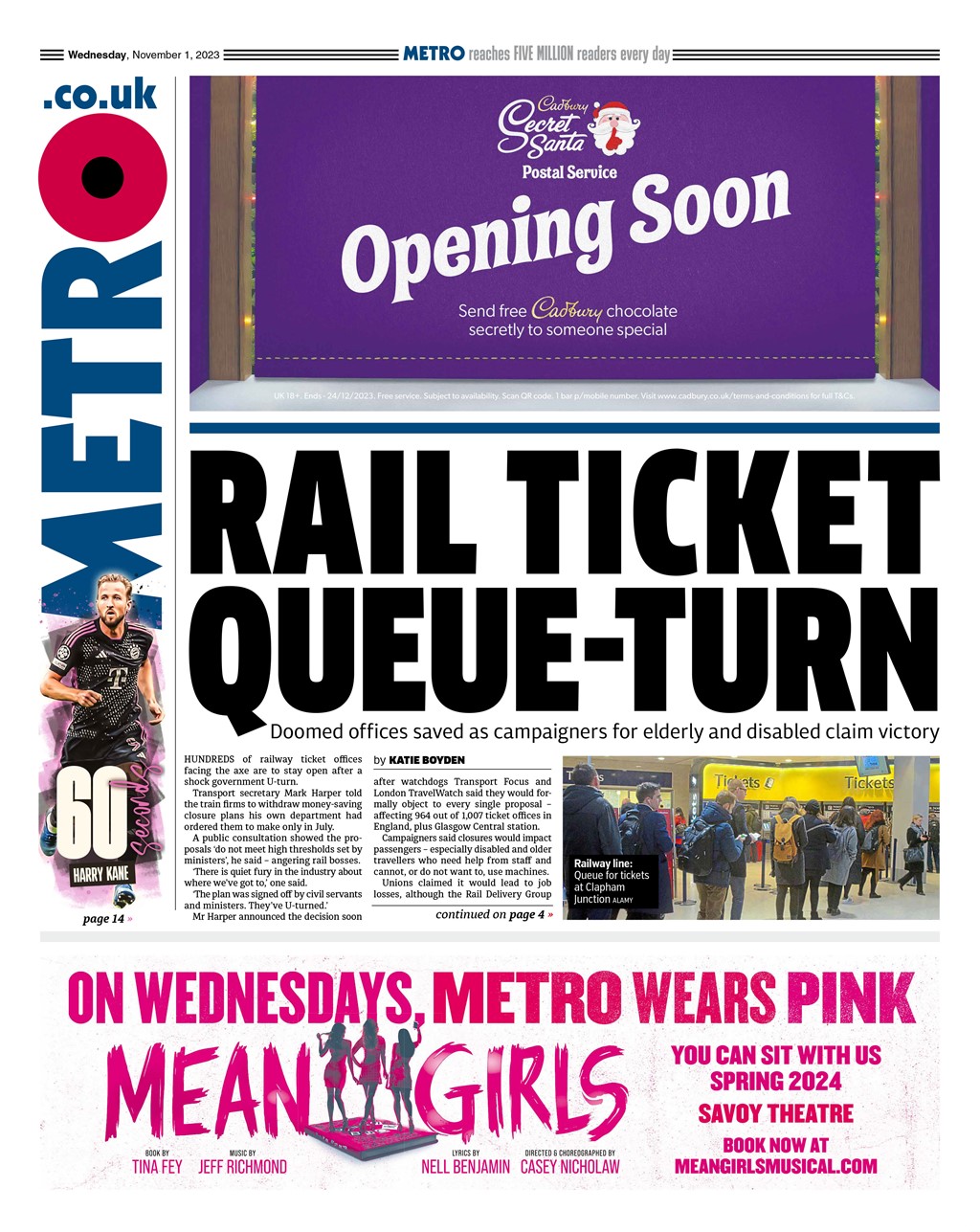 The Metro hails the government’s last-minute decision to scrap plans to close hundreds of rail ticket offices in England. The paper says the U-turn is a “victory” for campaigners for the elderly and disabled